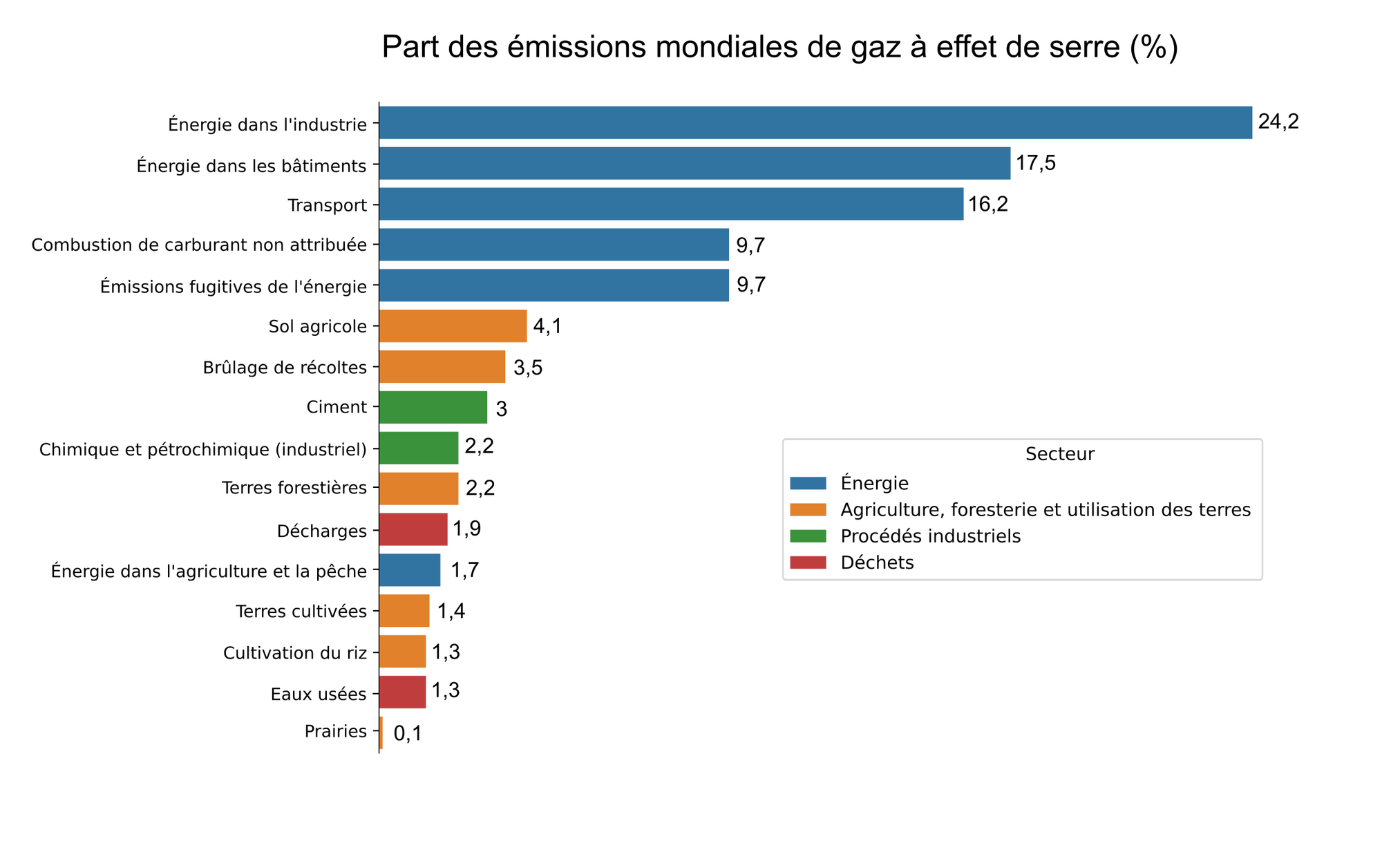 Maintenant que nous disposons d'un moyen d'analyser les gaz à effet de serre avec la même unité, explorons les principaux secteurs émetteurs de ces gaz :