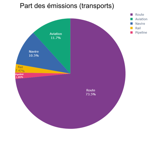 Les trois secteurs où l'on consomme le plus d'énergie sont l'industrie, le bâtiment et les transports. Parmi eux, le secteur des transports, incluant les voitures, les avions, etc., revient souvent sur le devant de la scène et anime le débat. Observons de plus près la part des différents moyens de transport dans ce secteur :