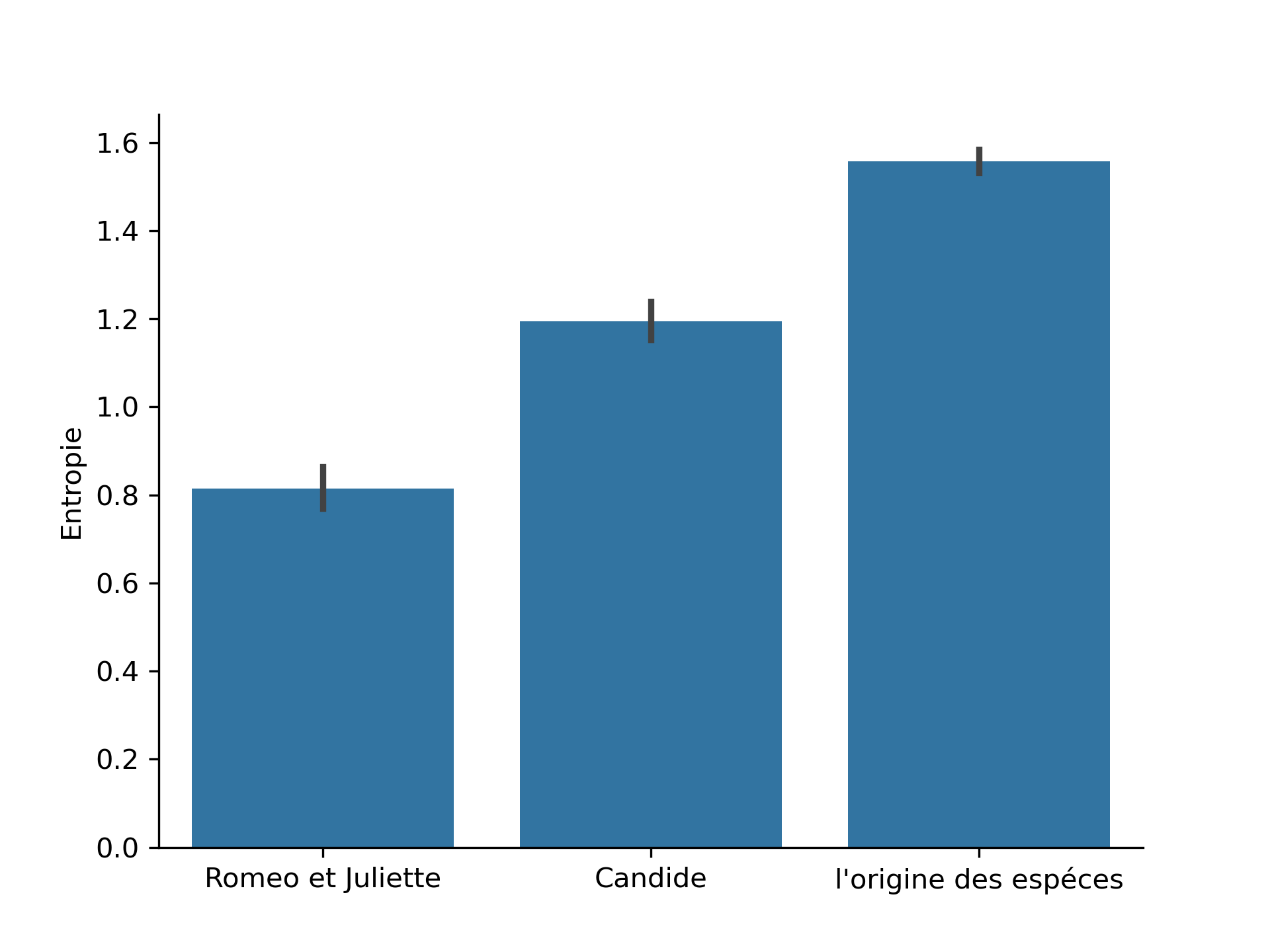 Pour illustrer notre propos, comparons l'entropie moyenne des phrases de quelques œuvres bien connues, avec des styles et objectifs différents :